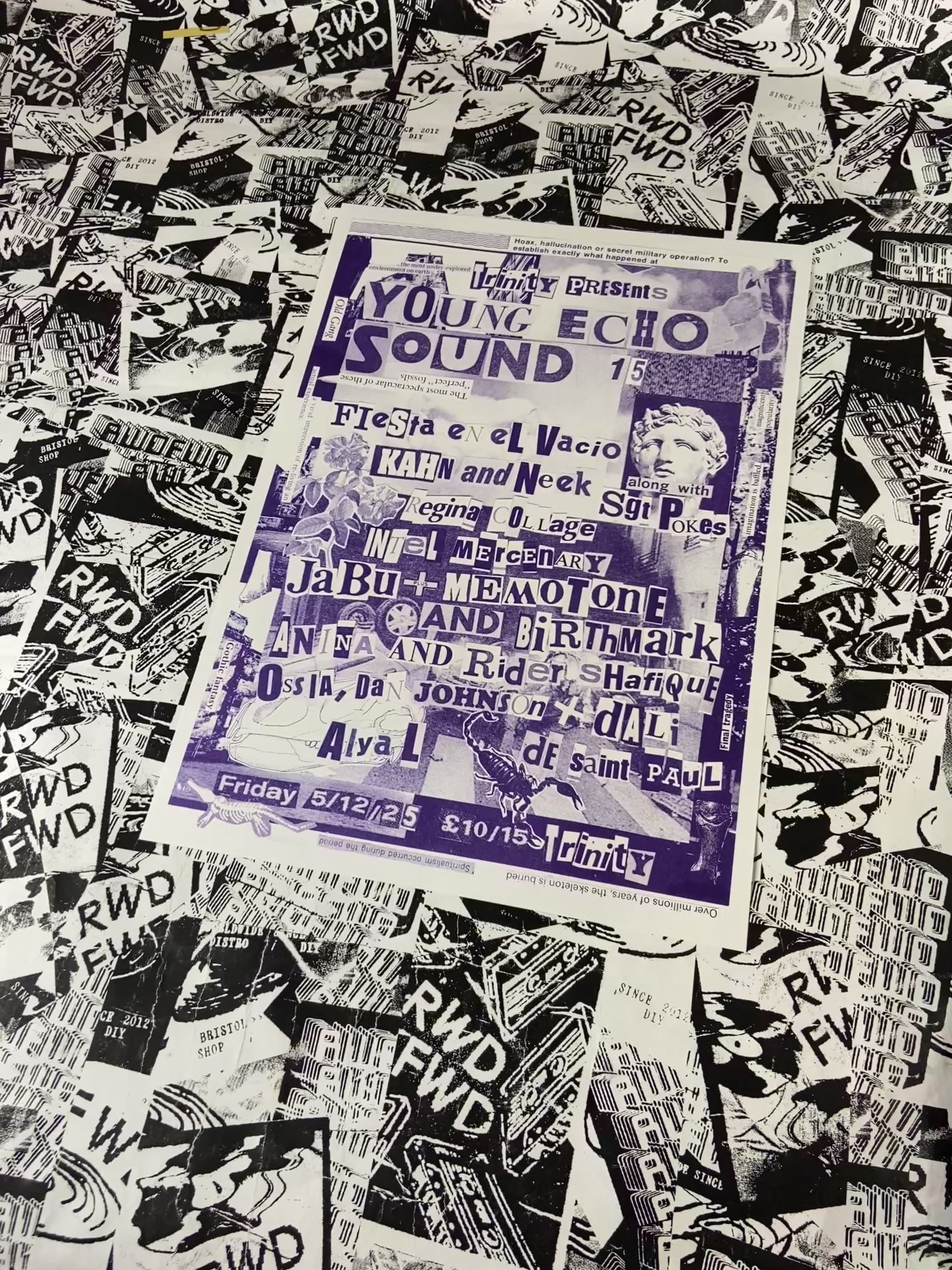 Special edition risograph printed version of the poster from the '15 Years Of Young Echo' session at Bristol's Trinity Centre at the end of '25.